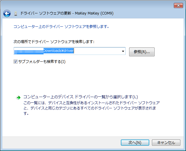 検索場所を聞かれるので、さきほどのinfファイルの置いてあるフォルダを指定。