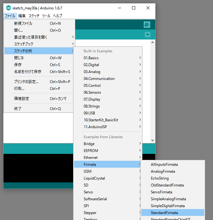 FirmataはArduino IDEの Firmata > StandardFirmata でソースと読み込みlittleBits Arduinoモジュールに書き込みます。