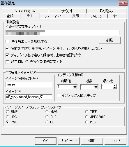 デフォルトはBMPで扱いにくい。一旦、イメージリストデフォルトファイルタイプは劣化が少ないPNGにしておく。その中で写真ぽいものは適宜個別の操作でJPGに変更。