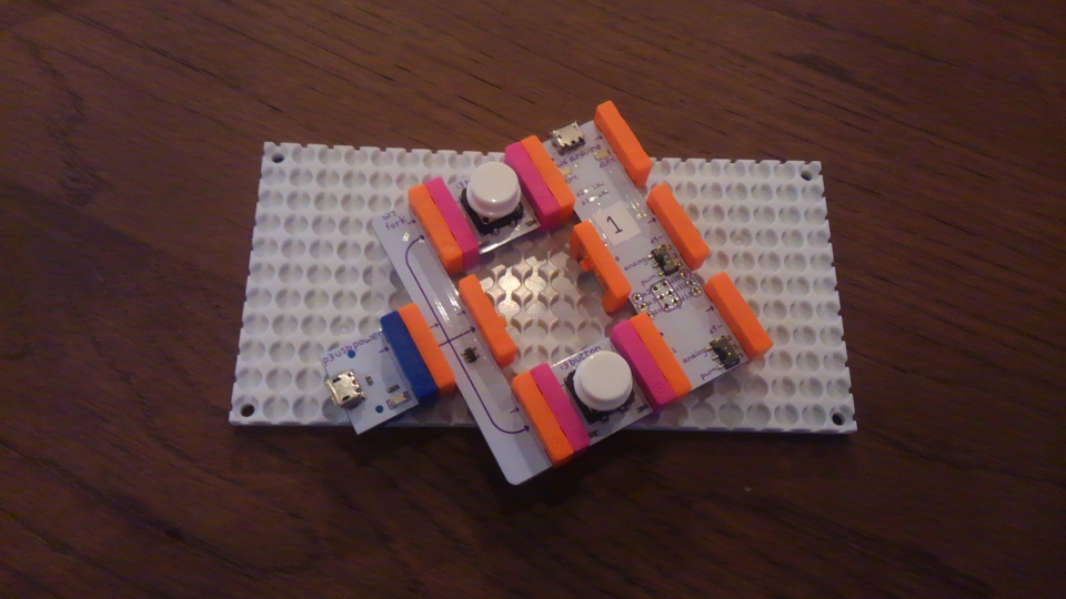 littleBitsは小型化は苦手なのですが、役割を示すカラーやデザインがいいアクセントになるので、素の状態でもいい感じに仕上がって楽しいですね。