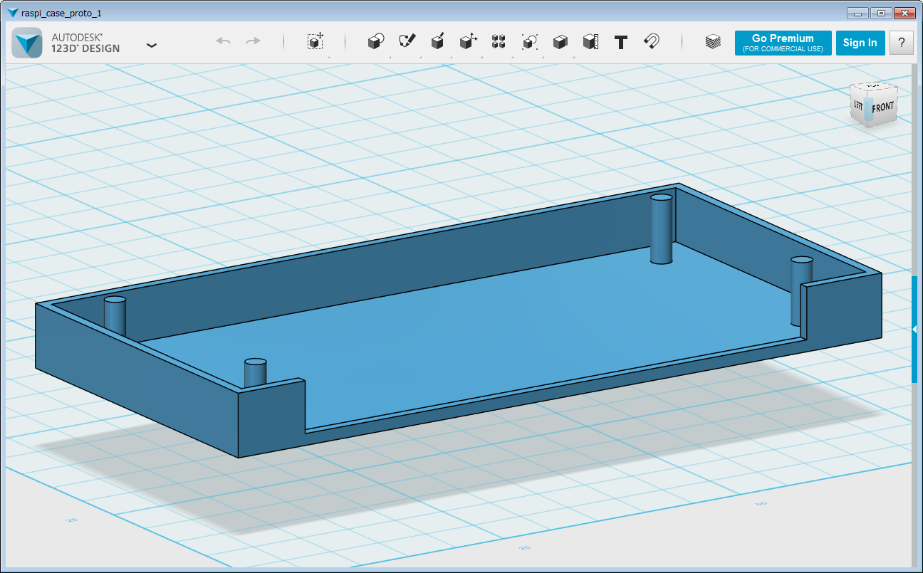 ケース部分設計はうまくいったので、フタも作ってみます。123D DESIGNで、先ほどのケースのサイズに合わせて作成します。また、Raspberry Pi ZeroのGPIOピンの出口も考慮して開けます(画像上のほう)