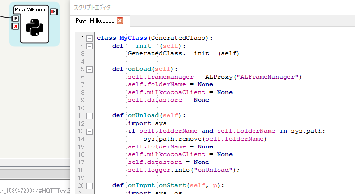 起動するとWaitしたのちにPush Milkcocoaと書かれたPythonボックスに到達してメッセージを送るようにします。