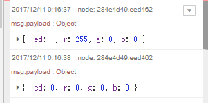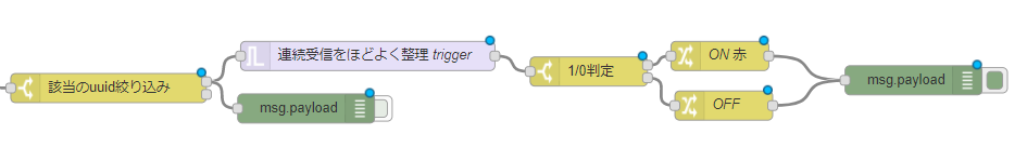 [{"id":"b3bb51b7.1287b","type":"trigger","z":"3ce2f3e6.31601c","op1":"1","op2":"0","op1type":"num","op2type":"num","duration":"250","extend":false,"units":"ms","reset":"","name":"連続受信をほどよく整理 trigger","x":886,"y":242,"wires":[["e170f7c.43a1d08"]]},{"id":"7fb73e85.33ee1","type":"change","z":"3ce2f3e6.31601c","name":"ON 赤","rules":[{"t":"set","p":"payload","pt":"msg","to":"{\"led\":1,\"r\":255,\"g\":0,\"b\":0}","tot":"json"}],"action":"","property":"","from":"","to":"","reg":false,"x":1246,"y":242,"wires":[["1a915b1a.f74fa5"]]},{"id":"e170f7c.43a1d08","type":"switch","z":"3ce2f3e6.31601c","name":"1/0判定","property":"payload","propertyType":"msg","rules":[{"t":"eq","v":"1","vt":"str"},{"t":"eq","v":"0","vt":"str"}],"checkall":"true","outputs":2,"x":1112,"y":258,"wires":[["7fb73e85.33ee1"],["2e719eb4.82e9f2"]]},{"id":"2e719eb4.82e9f2","type":"change","z":"3ce2f3e6.31601c","name":"OFF","rules":[{"t":"set","p":"payload","pt":"msg","to":"{\"led\":0,\"r\":0,\"g\":0,\"b\":0}","tot":"json"}],"action":"","property":"","from":"","to":"","reg":false,"x":1250,"y":293,"wires":[["1a915b1a.f74fa5"]]},{"id":"b245b31b.75c4c","type":"debug","z":"3ce2f3e6.31601c","name":"","active":false,"console":"false","complete":"false","x":823,"y":296,"wires":[]},{"id":"1a915b1a.f74fa5","type":"debug","z":"3ce2f3e6.31601c","name":"","active":true,"console":"false","complete":"payload","x":1444,"y":267,"wires":[]},{"id":"f932edf.201d71","type":"inject","z":"3ce2f3e6.31601c","name":"","topic":"","payload":"on","payloadType":"str","repeat":"","crontab":"","once":true,"x":126,"y":234,"wires":[["9bcbcbca.4383a8"]]},{"id":"f1f92458.1c9448","type":"inject","z":"3ce2f3e6.31601c","name":"","topic":"","payload":"off","payloadType":"string","repeat":"","crontab":"","once":false,"x":126,"y":314,"wires":[["9bcbcbca.4383a8"]]},{"id":"8a6df72a.fa5048","type":"json","z":"3ce2f3e6.31601c","name":"","pretty":false,"x":446,"y":274,"wires":[["6f9cfa4c.8baab4"]]},{"id":"9bcbcbca.4383a8","type":"scanBeacon","z":"3ce2f3e6.31601c","name":"","beacon_uuid":"","beacon_major":"","beacon_minor":"","x":286,"y":274,"wires":[["8a6df72a.fa5048"]]},{"id":"6f9cfa4c.8baab4","type":"switch","z":"3ce2f3e6.31601c","name":"該当のuuid絞り込み","property":"payload.uuid","propertyType":"msg","rules":[{"t":"eq","v":"[uuid]","vt":"str"},{"t":"else"}],"checkall":"true","outputs":2,"x":621,"y":275,"wires":[["b3bb51b7.1287b","b245b31b.75c4c"],[]]}]
