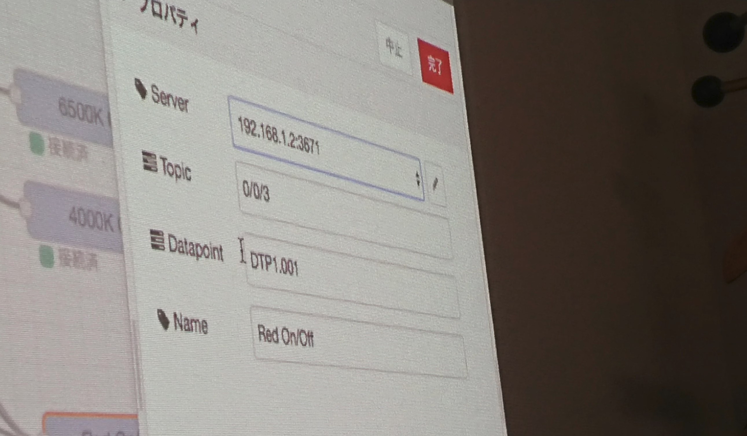 以前のDALIの実験で勝手知ったる感じで、すでに設定されているRaspberry PiのIPからNode-REDを見ながら仕組みを教えてもらいました。