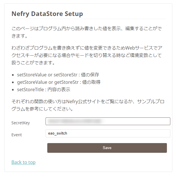 こちらもdotstudioさんのNefry BTとIFTTTを連携するの「Nefry BTにSecret Keyを登録する」を参考にNefryのData Storeの設定をします。