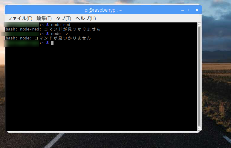 バージョンを確認してみるとnodeもnode-redも入っていません。画像にはないですが、もちろん、npmも入っていません。