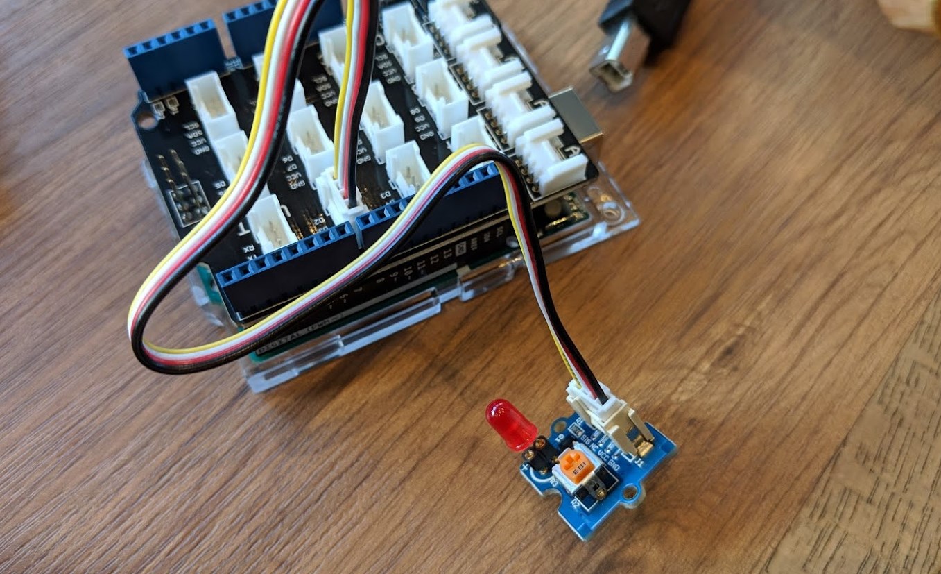 さあ、Groveボタンを押すとGrove LEDが光るシンプルな仕組みをArduinoに書き込んでつなげてみました!