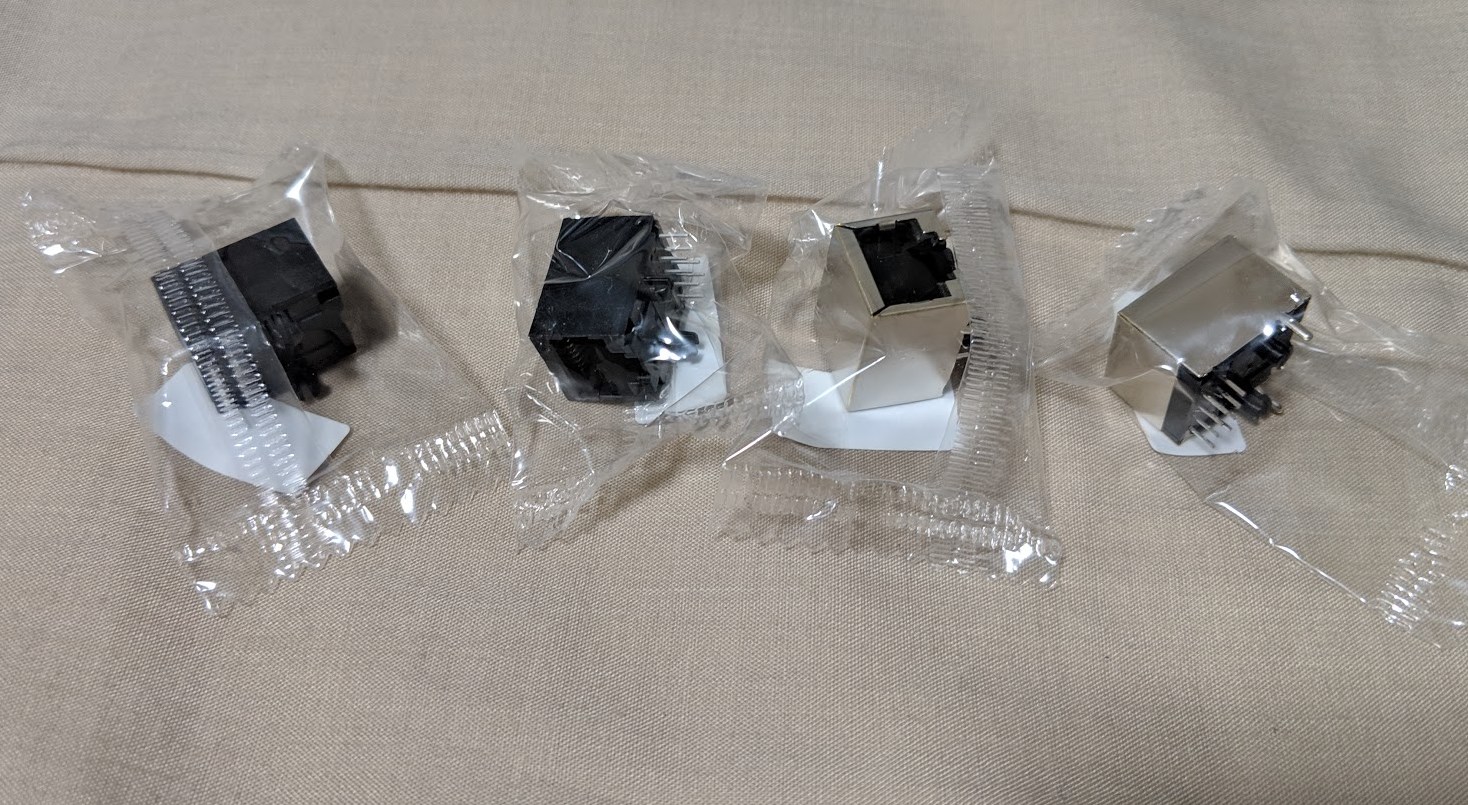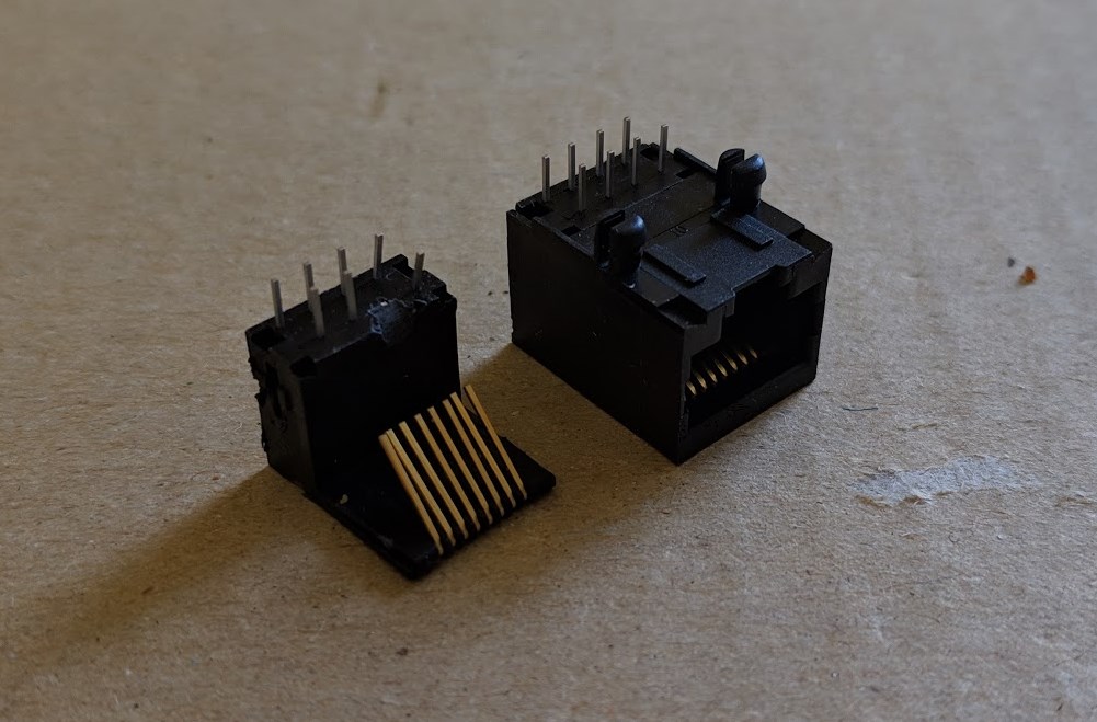 途中、LANをつなげることで左右で向かい合わさってしまって、どのようにピン配置が合うか混乱したんですが、はんだ付け失敗してしまったLANコネクタを分解して理解しました。