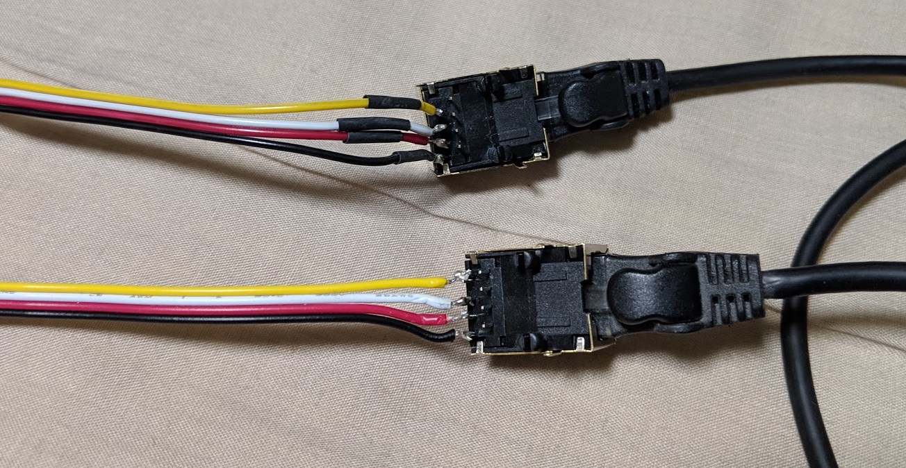非常に素直な仕組みで、上から出ている配線はLANケーブルにつながるところまでそのまま出ているので、クロスされてるとか、何かしらの法則であべこべになっているとか心配する必要はないです。ですので、上記の写真の通り、同じ向きにしたときにGroveケーブルの色とはんだ付けしたピンが合えばOKということになります。