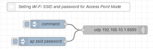 [{"id":"1a7b476.ee017b9","type":"udp out","z":"582469bb.4209e8","name":"","addr":"192.168.10.1","iface":"","port":"8889","ipv":"udp4","outport":"","base64":false,"multicast":"false","x":1130,"y":440,"wires":[]},{"id":"9532360f.6161b8","type":"inject","z":"582469bb.4209e8","name":"","topic":"","payload":"command","payloadType":"str","repeat":"","crontab":"","once":false,"onceDelay":"","x":900,"y":420,"wires":[["1a7b476.ee017b9"]]},{"id":"da15569d.2727b8","type":"inject","z":"582469bb.4209e8","name":"ap ssid password","topic":"","payload":"ap <ssid> <password>","payloadType":"str","repeat":"","crontab":"","once":false,"onceDelay":"","x":880,"y":480,"wires":[["1a7b476.ee017b9"]]},{"id":"de233722.2abce8","type":"comment","z":"582469bb.4209e8","name":"Setting Wi-Fi SSID and password for Access Point Mode","info":"","x":970,"y":360,"wires":[]}]