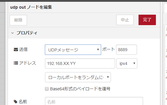 こちらの接続先の udp out ノードを、先ほど判明させたIPに向けるようにします。