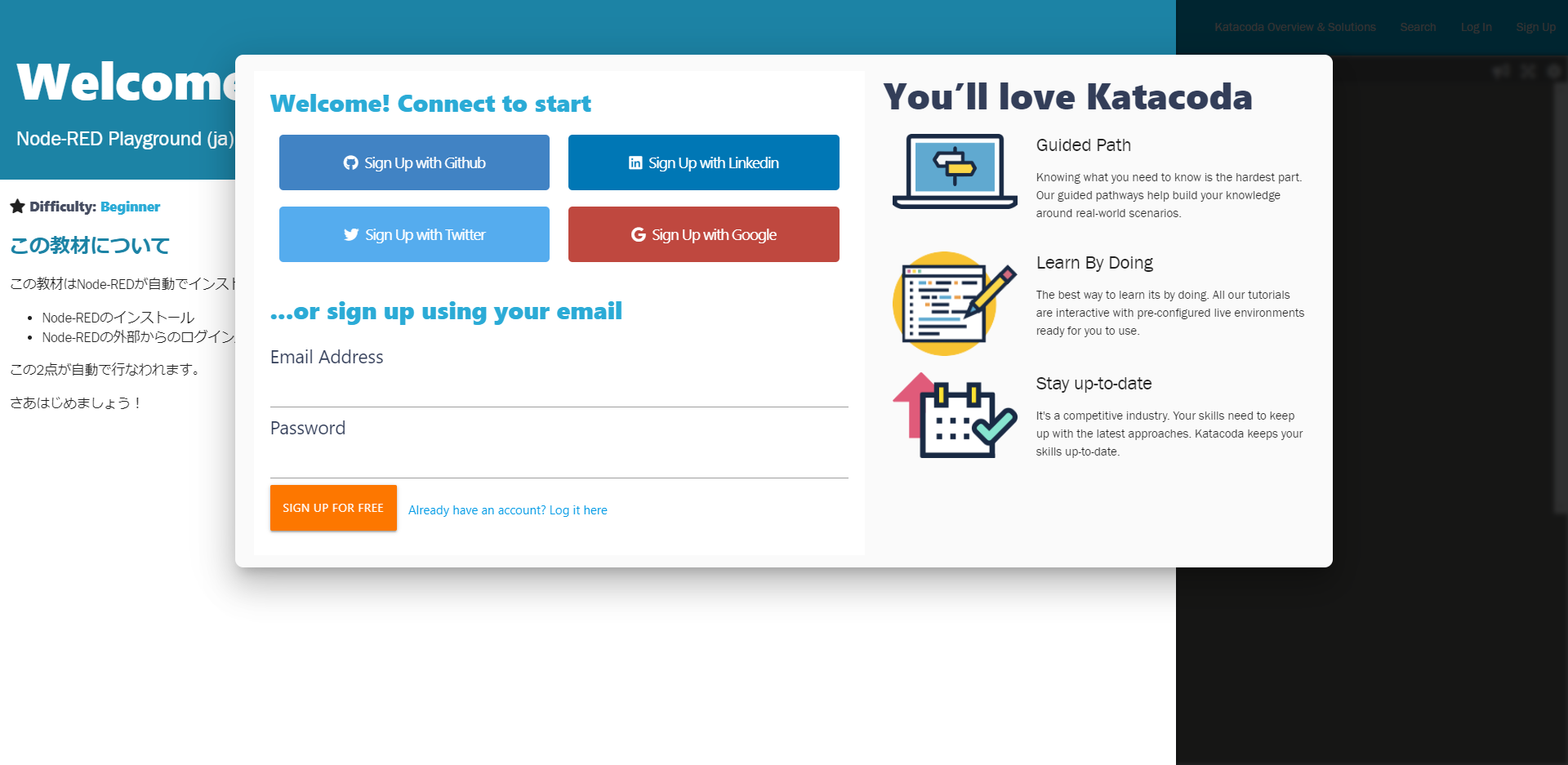ということで教材はこちらです。Katacodaアカウントを取得してから以下にアクセスします。