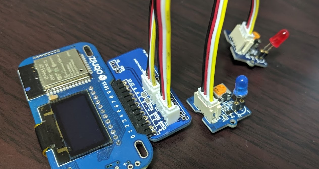 無事、Grove1・2と挿し込んだLEDの赤と青がちゃんと光りました!ピン番号の感覚もつかめました!