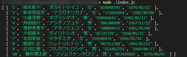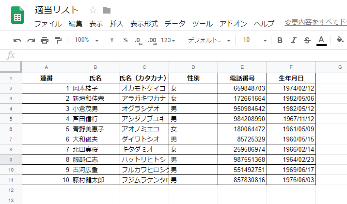 今回は 疑似個人情報データ生成サービス あたりでデータを作っておきます。