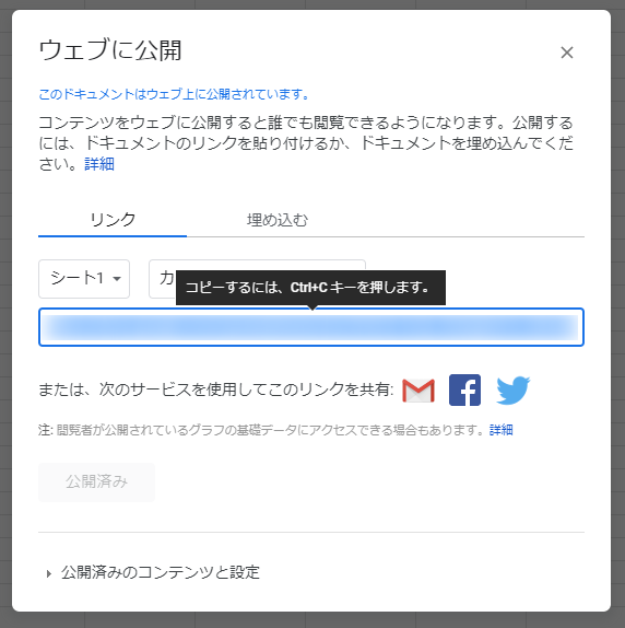 公開されたら出てきたURL(コピーするには Ctrl+C を押しますのところ)をメモしておきます。