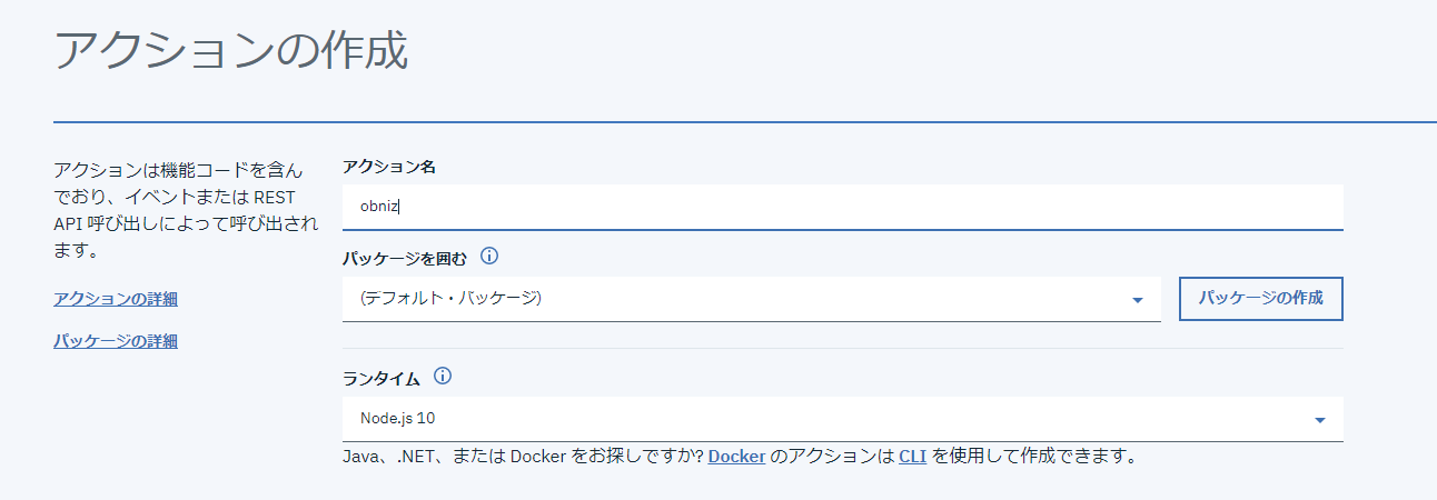 アクション名は obniz 。パッケージを囲むはデフォルトパッケージでOKです。ランタイムは Node.js 10 を指定して作成ボタンを押します。