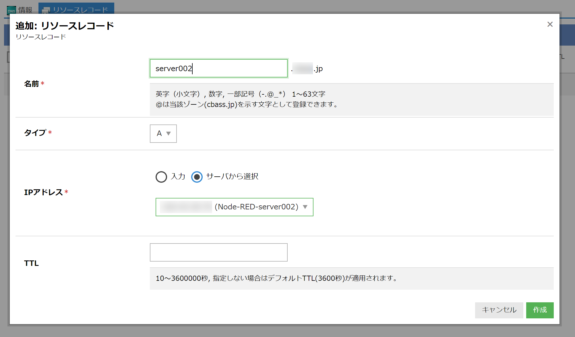 名前の欄でサブドメイン(今回はserver002にしました)をきめつつ、なんとIPアドレスの部分は、自分の立ち上げたサーバーからも選択できます。いちいち調べなくて便利!
