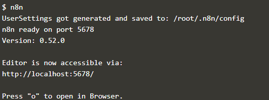 終わったら n8n のコマンドを打って起動します。このあたり Node-RED ぽいですね。