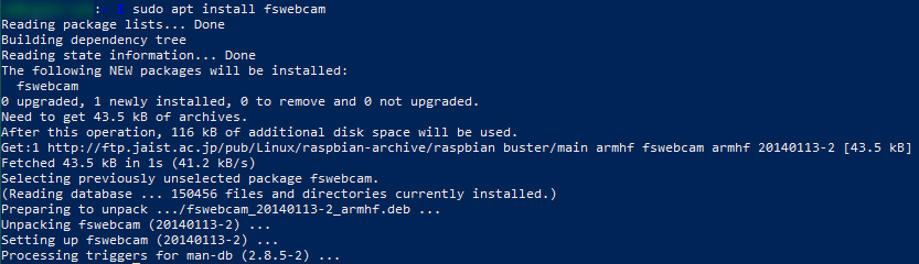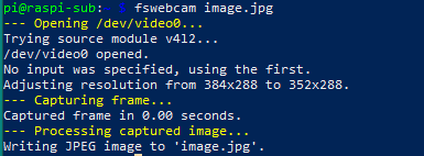 このまま、Node-REDのほうで動かしてもいいのですが、一度 fswebcam が動くかチェックしておきましょう。