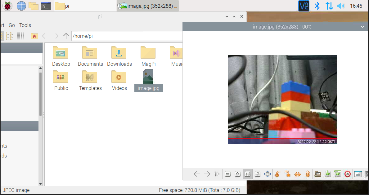 今回は /home/pi の階層で実行したので /home/pi/image.jpg に保存されました。うまくいかない場合は、この時点で何らかのエラーが出ます。