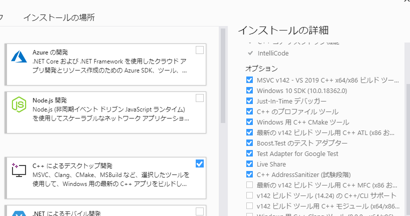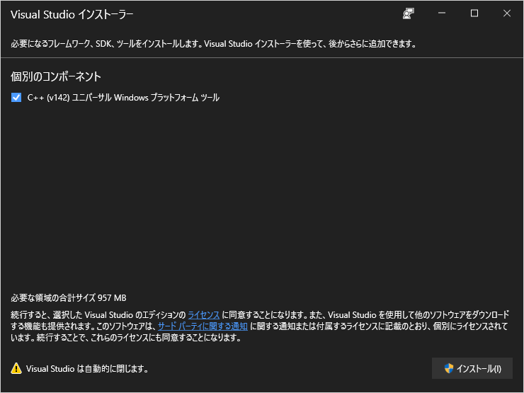 今回のターゲットである Visual Studio 2019 に、C++サポート、Unityサポートを入れると解決しました。