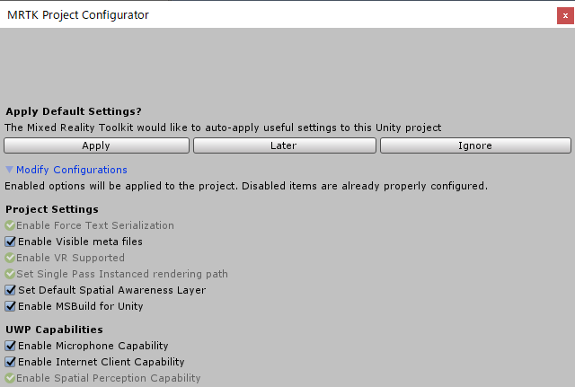 - Mixed Reality ツールキット用に Unity プロジェクトを構成する