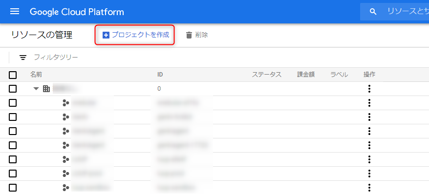 作成したら、リソース管理のリストに戻るので、先ほど作成したプロジェクトの設定をクリックします。