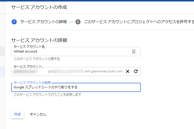 サービスアカウントの詳細で作成ボタンを押します。