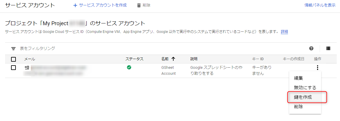 サービスアカウントが出来たら操作から鍵を作成します。