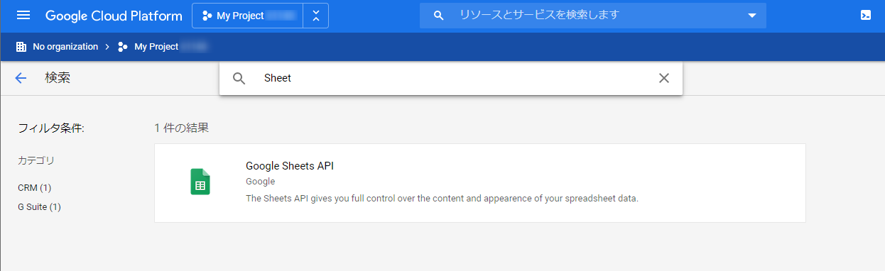 APIの検索ページに行くので Sheet で検索して絞り込みます。