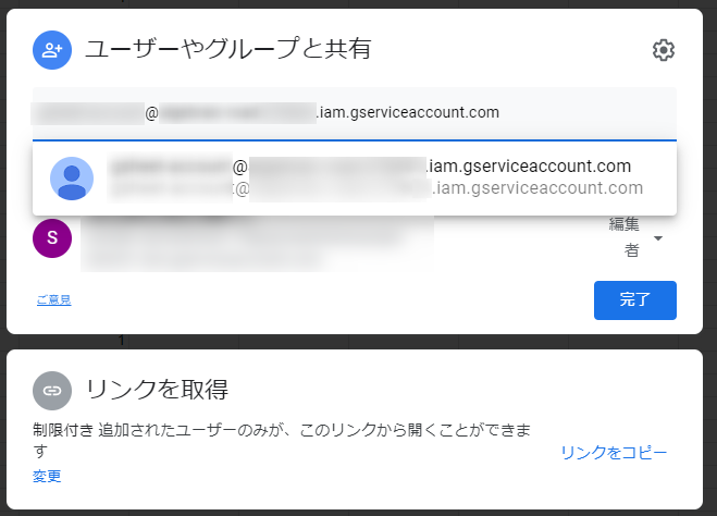 さきほどの client_email をペーストして候補が出てらクリックして完了を押します。