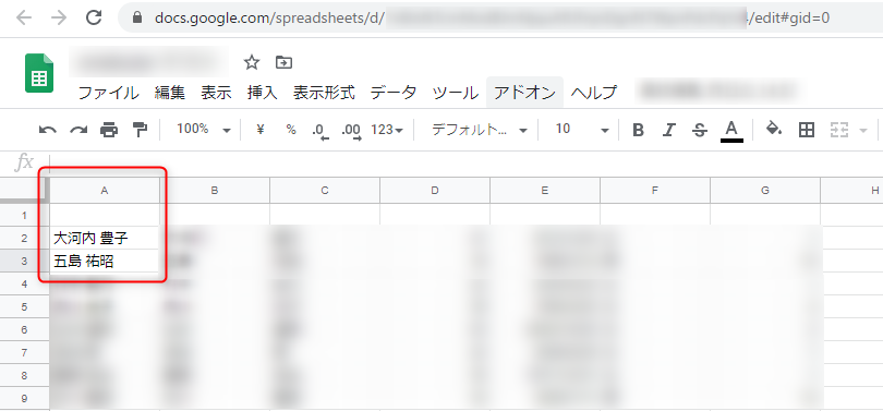 今回のGoogle スプレッドシートは、データはダミーの名前で埋められています。