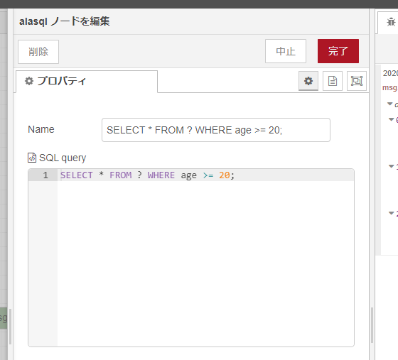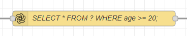 こちらでは SELECT * FROM ? WHERE age >= 20; というSQLクエリを指定していて、ageという値をみて20歳以上を検索しています。 ? というのが `msg.payloadP で来たデータを指しています。