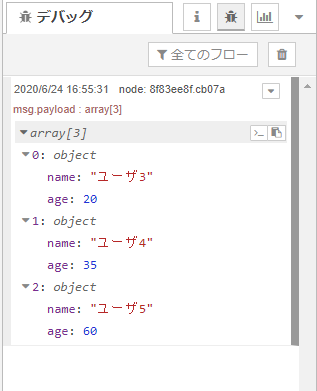 [{"id":"4b1563b.551df9c","type":"alasql","z":"f5146fe6.90b9f","name":"SELECT * FROM ? WHERE age >= 20;","query":"SELECT * FROM ? WHERE age >= 20;","x":660,"y":1200,"wires":[["8f83ee8f.cb07a"]]},{"id":"8f83ee8f.cb07a","type":"debug","z":"f5146fe6.90b9f","name":"","active":true,"tosidebar":true,"console":false,"tostatus":false,"complete":"payload","targetType":"msg","x":930,"y":1200,"wires":[]},{"id":"2549e15d.d0eebe","type":"inject","z":"f5146fe6.90b9f","name":"データ","topic":"","payload":"[{\"name\":\"ユーザ1\",\"age\":15},{\"name\":\"ユーザ2\",\"age\":12},{\"name\":\"ユーザ3\",\"age\":20},{\"name\":\"ユーザ4\",\"age\":35},{\"name\":\"ユーザ5\",\"age\":60}]","payloadType":"json","repeat":"","crontab":"","once":false,"onceDelay":0.1,"x":370,"y":1200,"wires":[["4b1563b.551df9c"]]}]