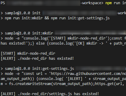"init:mkdir":"node -e \"console.log('[START] mkdir-node-red_dir');const fs = require('fs');const path_nodered_dir = './node-red_dir';if (fs.existsSync(path_nodered_dir)) {console.log( '[ALERT] ' + path_nodered_dir + ' has existed!');} else {console.log('[OK] mkdir -> ' + path_nodered_dir );fs.mkdirSync(path_nodered_dir);}\"",