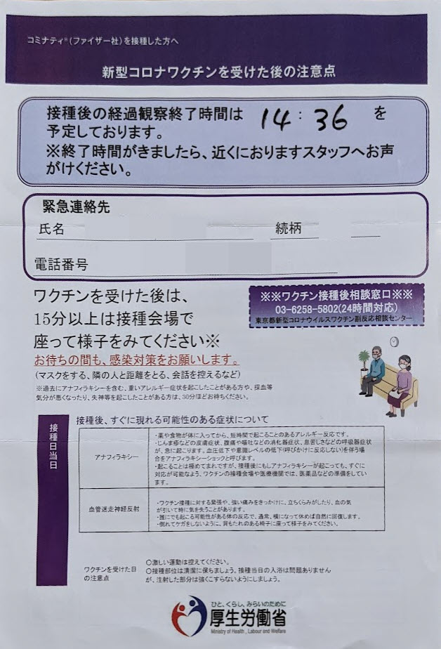 - 前回と違って新型コロナワクチンを受けた後の注意点のプリントを渡されました。15分は経過観察。