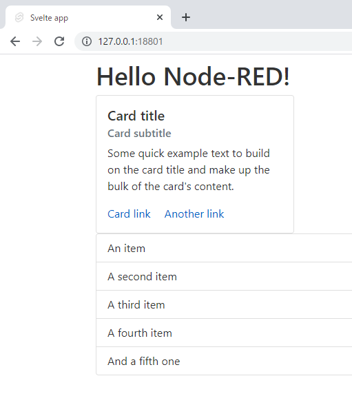 Bootstrap の CSS が反映され h1 見出しとリストが表示されました。<h1>Hello {name}!</h1> でデータバインディングしていた name という値が Hello Node-RED! に置き換わっていて Svelte のテンプレート構文もしっかり動いています。
