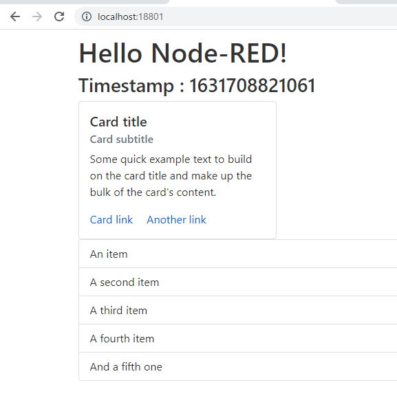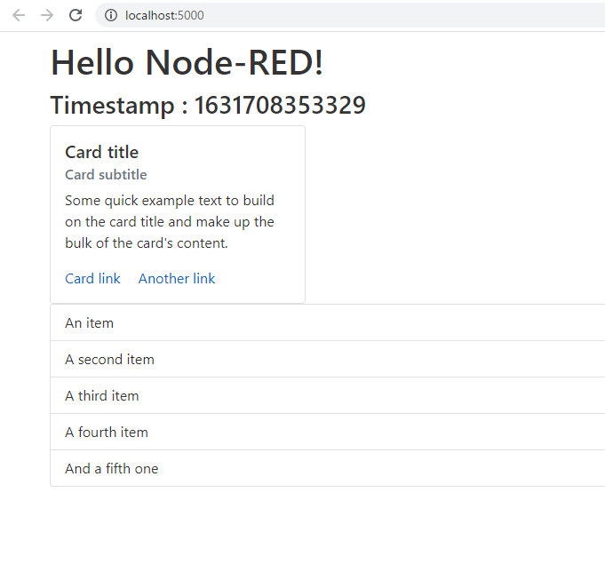 このように、開発サーバー http://localhost:5000/ で表示されて <h3>Timestamp : {timeStamp}</h3> の timeStamp の値が、Node-RED から受け取ったタイムスタンプの値に置き換わっています。