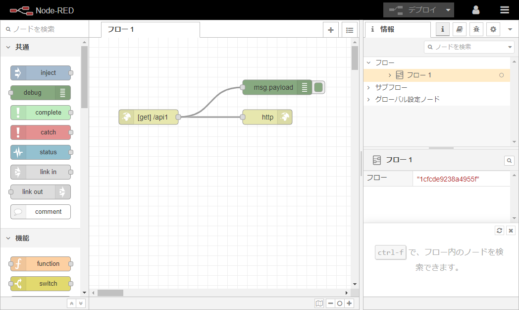 npm run node-redでローカルの Node-RED 起動 http://127.0.0.1:18801/admin/にブラウザからアクセスして作業。- ローカルで Node-RED のフローをつくって、Heroku に反映していいなってところで落ち着かす。