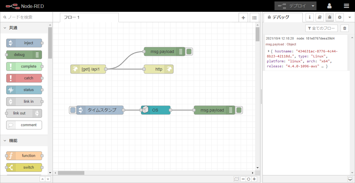 ということで、無事、追加ノードとして node-red-contrib-os ノードが加わっていて、かつ、inject ノードを動かしてみると debug ノードで、Heroku が動いている OS 情報がちゃんと取得出来て動いていることを確認できました!
