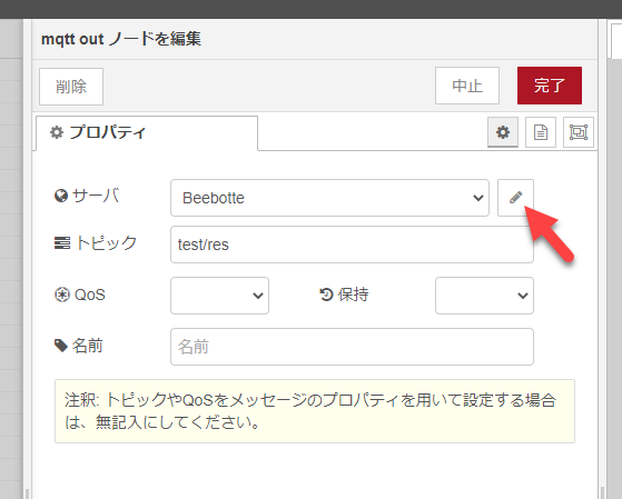MQTT out ノードをダブルクリップしてプロパティを表示します。