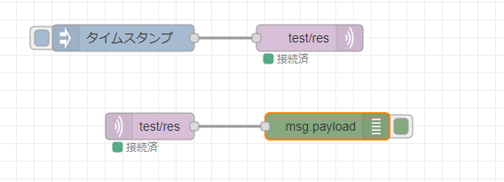 クリックすると MQTT in ノードが test/res トピックからデータを受信して デバックタブに、さきほど送られたタイムスタンプのデータが表示されて、無事やり取りが確認できました!