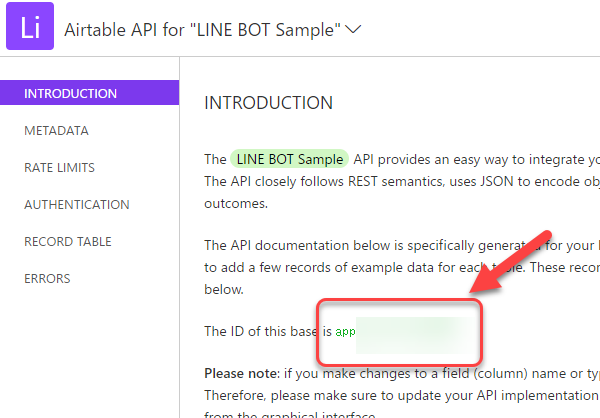 今回の Base の API ページに移動すると、こちらで app ではじまる Base ID が取得できるのでテキストエディタにメモしておきます。