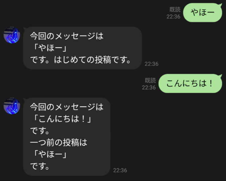 そして、このようにやりとりされます。「やほー」を送ったときは、はじめての投稿なので今回のメッセージのみで前のメッセージはなし、それ以降は、今回のメッセージと一つ前のメッセージを返答します。