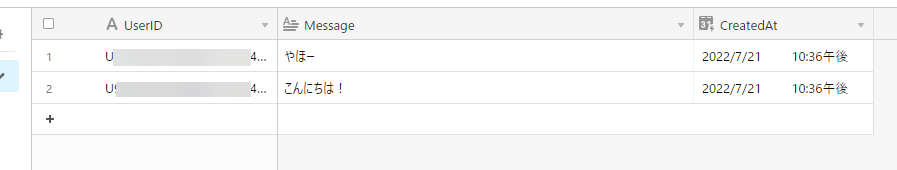 まず、Airtable にデータが登録されるときに CreatedAt で自動的に作成日時が登録されます。UserID と Message しか登録していないんのですが、CreatedAt で自動的に作成日時が登録されます。