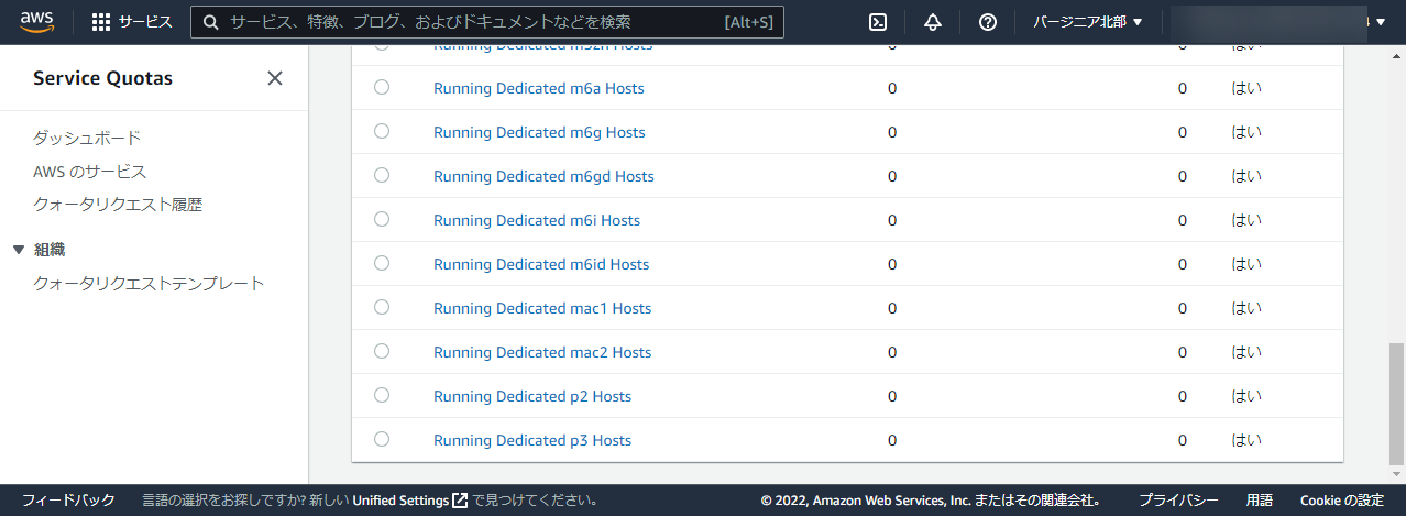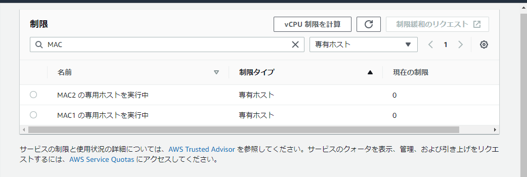 指定のリージョンの Service Quotas で Amazon EC2 のところから mac1 と mac2 のリクエストをしました。