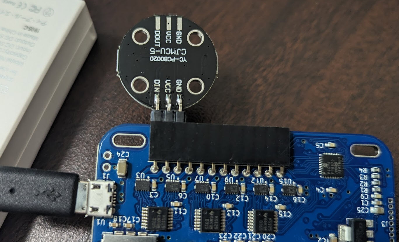 DIN が 0 番ピン、VCC が 1 番ピン、 GND が 2 番ピンで挿しこみました。