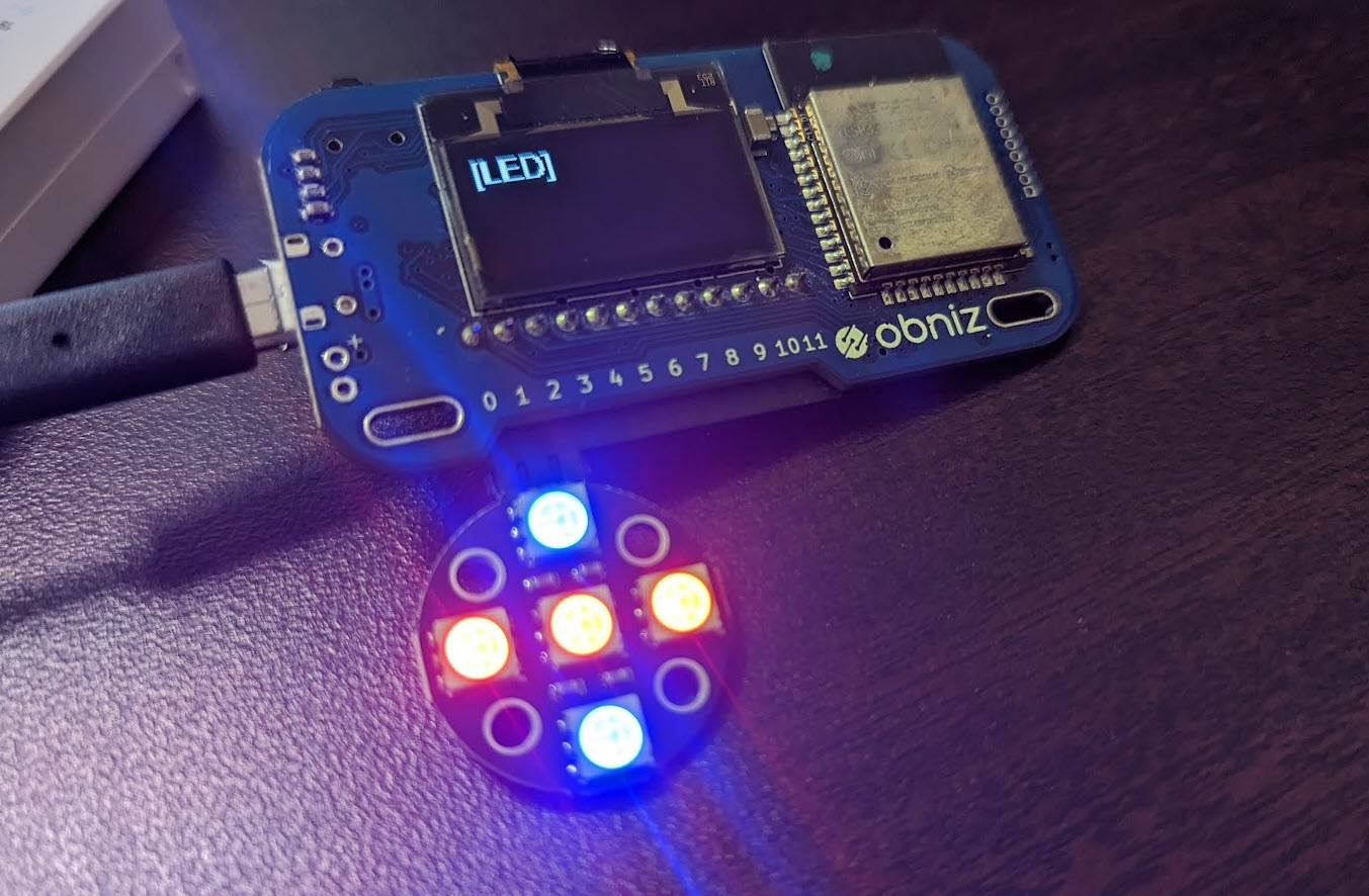 挿したピンに合わせて、このように LED 周辺は書き直しました。全体のソースは 共立エレショップのピンヘッダ実装済 NeoPixel WS2812B フルカラー LED モジュール 8 素子タイプが obniz でうまく動作したメモ を参考にしてください。