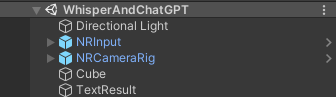 左の Cube を配置して、右に TextMeshPro で TextResult という結果を表示するテキストを用意します。TextResult は日本語を表示するので TextMeshPro で日本語表示可能な対応をしています。