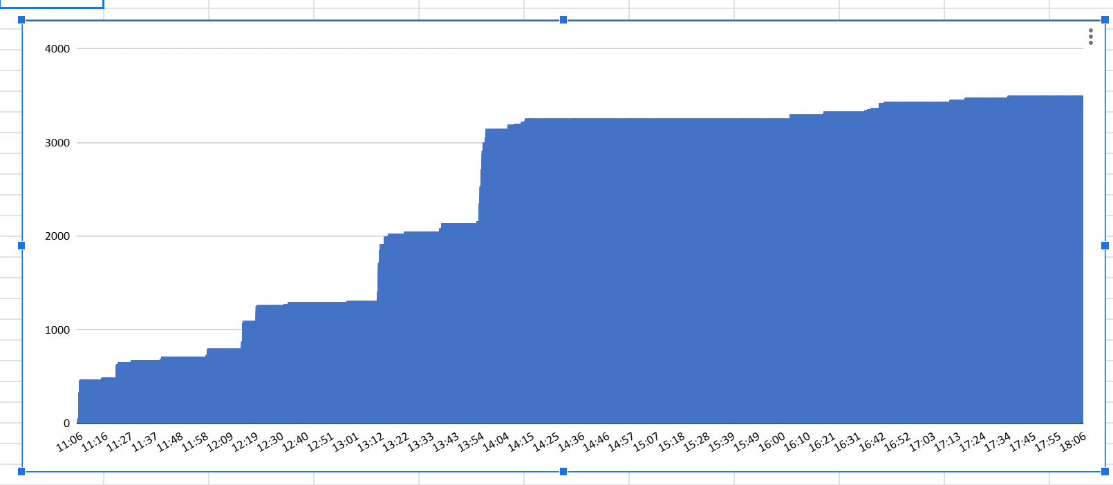 これは 1 年生の盛り上がりの様子。生データです。授業が終わったときに、後半の学生の何人かがリアクションシステムにハマってくれて、めちゃくちゃ押してくれたので最終的に 25000 くらいまで行ってました!楽しがってくれるのはうれしいですね。